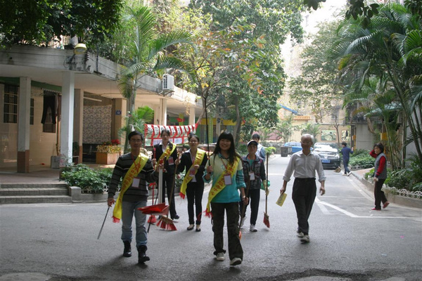 本次大掃除活動(dòng),除了廣州香江義工隊(duì)外,曉園社區(qū)的很多居民也參與其中;顒(dòng)開始前,穗星社工對(duì)人員進(jìn)行了分組,并劃定了各小組負(fù)責(zé)打掃的區(qū)域,之后向大家分發(fā)了勞動(dòng)工具。工具分發(fā)完畢后,活動(dòng)正式開始。大家有的手持掃帚,有的手拿簸箕,有的手持鐵鉗,掃的掃,撿的撿,個(gè)個(gè)忙的不亦樂乎。每個(gè)人都仔細(xì)搜尋著垃圾,生怕有忽略掉的部分。有很多垃圾散落在花壇的小樹叢中,用小鉗子夠不到,為了徹底清潔,義工們都索性直接用手去撿。也許是被大家的熱情感動(dòng),活動(dòng)中,又陸續(xù)有幾位高齡長(zhǎng)輩從自家拿來掃把等工具主動(dòng)加入。