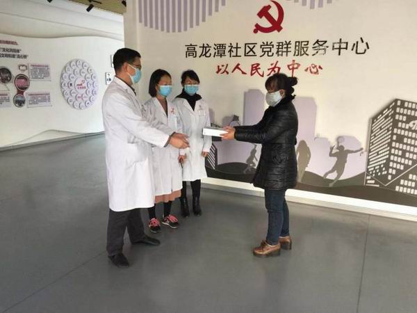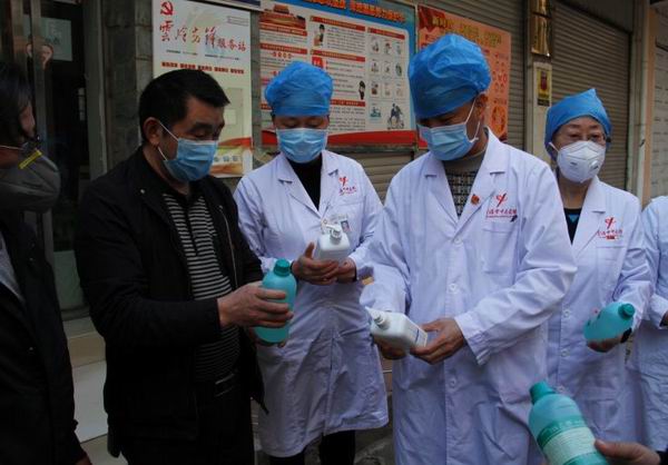 景明院長帶領(lǐng)三支部、七支部黨員為葫泉社區(qū)工作人員送上支部黨員捐資購買的酒精、消毒靈等物品。
