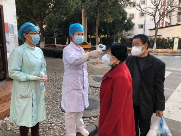 十二支部黨員到葫田社區(qū)參與社區(qū)疫情防控工作,為社區(qū)居民測量體溫。