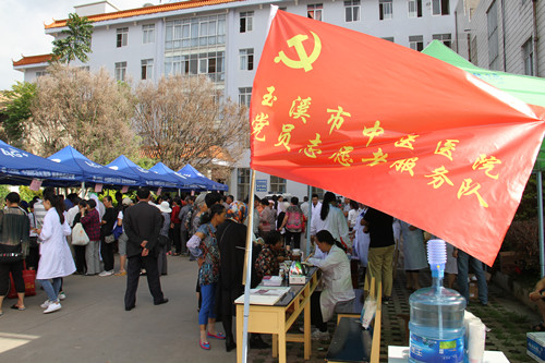 8:30分,醫(yī)院黨員志愿服務(wù)隊隊員剛一下車,就看到峨山縣中醫(yī)醫(yī)院院區(qū)內(nèi)匯集了近500余人等待義診的群眾。隊員們馬上進(jìn)入診臺開始為他們采血、驗血,進(jìn)行糖尿病篩查,通過診舌號脈、體格檢查,開處中西藥處方、針灸、推拿等治療,并解答他們的健康疑問,為他們提供診療意見,進(jìn)行健康指導(dǎo),普及健康知識。