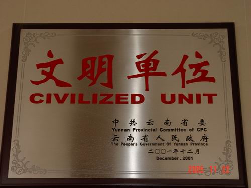 二00一年榮獲中共云南省委 云南省人民政府文明單位