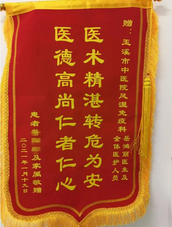 一直說(shuō)著感謝的話是位年輕的媽媽。她是被診斷位成人斯蒂爾病(AOSD)的患者?;貞浧鹚床〉慕?jīng)歷,可謂是一波三折。在去年懷孕期間,全身肌肉和關(guān)節(jié)出現(xiàn)酸痛。反復(fù)的就診也沒(méi)能緩解病情,甚至還一度失去了生活自理能力。在家人的建議下,來(lái)到我院急診內(nèi)科就診。經(jīng)風(fēng)濕免疫科和急診內(nèi)科攜手診治后,患者康復(fù)出院。這天,她將感謝信和錦旗送到科室醫(yī)護(hù)人員手上,也將這一份肯定及感謝送到他們手上。