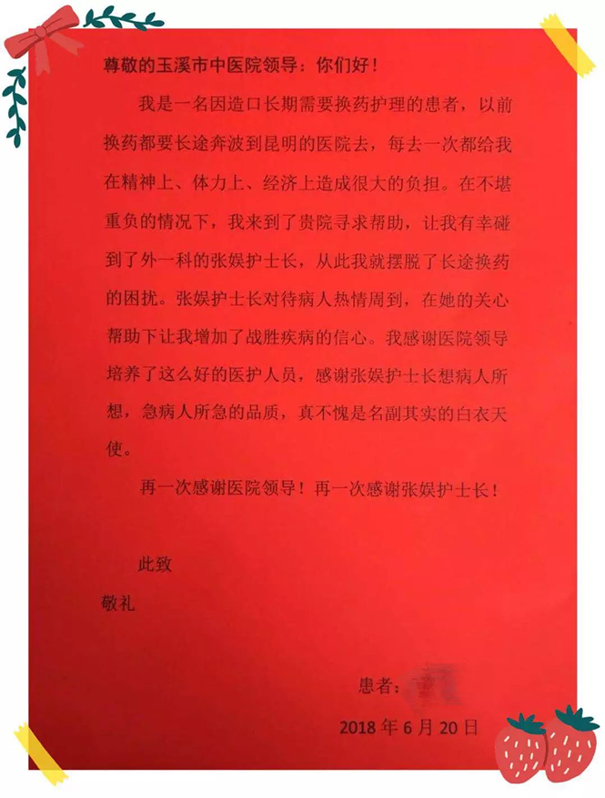 就在前幾天,我院外I科收到了來自一名治療患者的感謝信?;颊呙袕垊偅ɑ?,男,漢族,66歲,退休干部。2017年2月,因查出惡性腫瘤,到昆明工人醫(yī)院做了膀胱切除術(shù)。術(shù)后需終身換造口,所以該患者一直去昆明換藥做治療,每個月來回往返昆明玉溪三四趟,就這樣來回跑了一年多,舟車勞頓,身心俱疲。