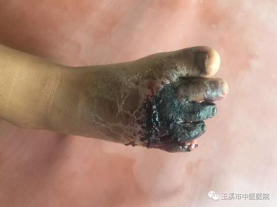 血常規(guī)示:白細胞18.29×109/L(正常值為:3.5-9.5109/L),查體見:患兒右前足呈干性壞疽,右足第3、4趾發(fā)黑壞死,無血循環(huán),壞疽波及前足背及近端跖骨背側(cè),有少許分泌物,右足第2、5趾發(fā)紫,趾端血循環(huán)不佳,足背動脈偏弱。