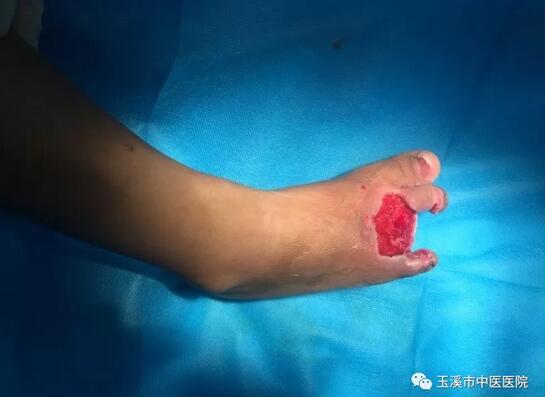 考慮患兒為右足干性壞疽,右足壞疽若不能及時處理,后期容易出現(xiàn)壞疽面積增大,向肢體近端蔓延,右下肢肢體壞死,需要截肢以控制壞疽及感染。并且患兒發(fā)熱,足部感染極其容易出現(xiàn)膿毒血癥及敗血癥,危及生命,出現(xiàn)患兒猝死等。??小兒骨科本著“保命保肢“的原則,詳細制定了手術(shù)方案,先進行壞死足趾截除,清除壞死組織行VSD覆蓋創(chuàng)面,密閉負壓吸引,術(shù)后積極控制感染,多次手術(shù)清創(chuàng)待創(chuàng)面骨及肌腱等組織被肉芽組織覆蓋滿意后植皮以消滅創(chuàng)面。