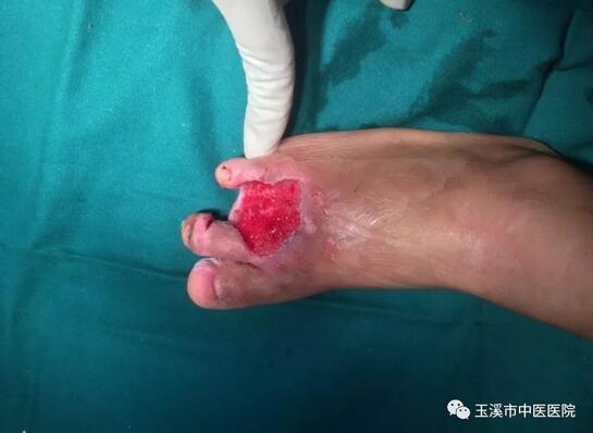 第一次手手術(shù)行壞死足趾截除,清除壞死組織行VSD覆蓋創(chuàng)面,密閉負壓吸引術(shù),術(shù)中骨及肌腱等組織外露,予VSD覆蓋創(chuàng)面,積極控制感染,術(shù)后7天拆除VSD見創(chuàng)面肉芽部分生長,第2、5趾由原來的發(fā)紫、肢端血循環(huán)極差逐漸恢復(fù)循環(huán),感染明顯得到控制(如下圖):