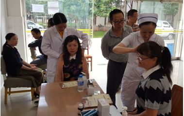 此次義診活動(dòng)由紀(jì)委李文平書記帶隊(duì),選派醫(yī)務(wù)科、心病科、腦病科、糖尿病科、針灸推拿Ⅰ科、治未病科、外Ⅱ科、皮膚科、功能科、檢驗(yàn)科等醫(yī)務(wù)人員組成了1支15人義診醫(yī)療隊(duì)到玉溪市工業(yè)財(cái)貿(mào)學(xué)校開展以“服務(wù)教師,關(guān)愛健康”為主題的義診咨詢活動(dòng)。義診由各科室分區(qū)域進(jìn)行,在義診現(xiàn)場,前來咨詢的絡(luò)繹不絕,有教師、員工,還有學(xué)校員工家屬。醫(yī)務(wù)人員認(rèn)真仔細(xì)的為他們診斷病情,講解衛(wèi)生保健、安全飲食、合理用藥等衛(wèi)生常識;免費(fèi)測量血壓、血糖、血型,免費(fèi)做心電圖檢查,健康咨詢、發(fā)放健康宣教資料等,工作有條不紊的進(jìn)行著。義診活動(dòng)充分發(fā)揮玉溪市中醫(yī)醫(yī)院的中醫(yī)診療特色,免費(fèi)為辛勤教書育人的教師們做具有中醫(yī)特色的健康檢測項(xiàng)目:經(jīng)絡(luò)檢測,就教師們在中醫(yī)養(yǎng)生、保健治療等方面問題進(jìn)行答疑解惑,并在現(xiàn)場為教師們免費(fèi)做針灸、推拿、耳穴壓豆治療等治療。