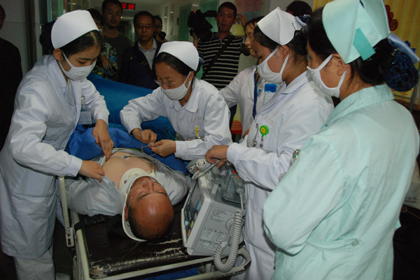 這次急救演練與前幾次不同的是,“患者”是由專家自行請來的“標(biāo)準(zhǔn)化病人”扮演,其曾經(jīng)多次扮演過這一角色,由專家親自扮演“患者”的家屬。當(dāng)晚8時(shí)許,“患者”在醫(yī)院突然摔倒,摔倒的位置不再是設(shè)置在急診科附近,而是設(shè)置在一個(gè)急救能力相對薄弱的治療科室的樓道口。路過的護(hù)士突遇這名昏迷的重傷“患者”后,急救的大幕就此拉開。很快,骨傷科、外科、急診科醫(yī)護(hù)人員紛紛趕來急救,患者在進(jìn)行了初步的急救處置和傷情判斷后,被擔(dān)架隊(duì)緊急送到CT室檢查,在得出CT的診斷結(jié)果后,“患者”被緊急送到重癥監(jiān)護(hù)室,這時(shí)候病房突然停電了,醫(yī)護(hù)人員采取應(yīng)急手段應(yīng)用手電和應(yīng)急燈的照明繼續(xù)進(jìn)行搶救,搶救過程中骨傷科、外科科室主任及時(shí)趕到現(xiàn)場參加會診?!盎颊摺痹跁\過后,發(fā)現(xiàn)傷情嚴(yán)重,緊接著被馬上送進(jìn)手術(shù)室。約一小時(shí)的急救過程,讓記者和在場的住院患者無不感到驚心動魄?,F(xiàn)場的醫(yī)護(hù)人員雖然一會兒就明白這是一場演練,但他們毫不松懈的“假戲真做”,將演練進(jìn)行到最后。