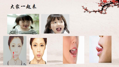 第一節(jié):伸舌運動。張口,緩緩將舌尖盡量伸出,在慢慢縮回,閉口,反復9次。